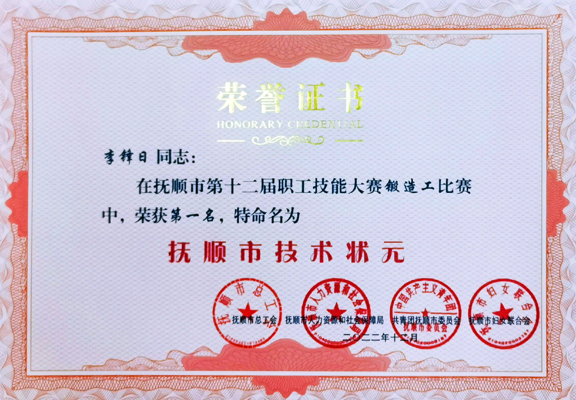 2022年,撫順市總工會聯(lián)合市人社局、團(tuán)市委、市婦聯(lián)開展了撫順市第十二屆職工技能大賽。撫順特鋼將鍛造工做為此次大賽比賽工種,組織80名鍛造工參加此次大賽,通過技能培訓(xùn)和技術(shù)比武,選拔出32名優(yōu)秀選手參與決賽,經(jīng)過理論考試和實際操作考核等環(huán)節(jié)比賽,獲得第一名選手,被命名為“撫順市技術(shù)狀元”,獲得第二至第五名的選手,被命名為“撫順市技術(shù)明星”;獲得第六名至第十名的選手,被命名為“撫順市優(yōu)秀選手”。同時撫順市總工會還授予大賽各工種的技術(shù)狀元為撫順市“五一”勞動獎?wù)聵s譽(yù)稱號,共青團(tuán)撫順市委員會授予大賽各工種青年技術(shù)狀元為撫順青年“五四”獎?wù)聵s譽(yù)稱號。