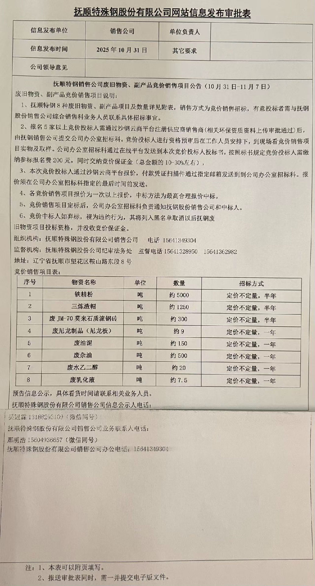 撫順特鋼銷售公司廢舊物資、副產(chǎn)品競價(jià)銷售項(xiàng)目公告(10月31日-11月7日
