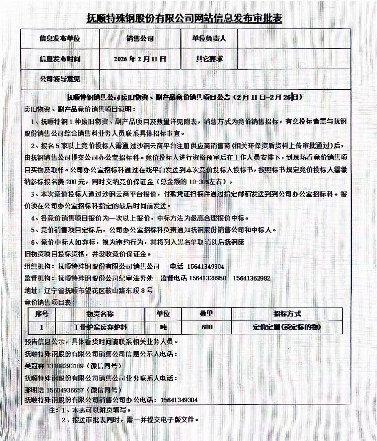 撫順特鋼銷(xiāo)售公司廢舊物資、副產(chǎn)品競(jìng)價(jià)銷(xiāo)售項(xiàng)目公告(2月11日-2月26日)